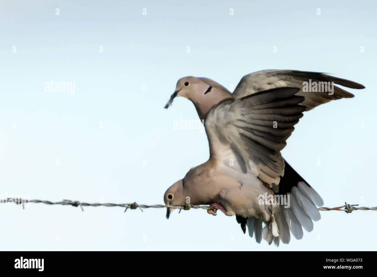 Low Angle View Of Mourning Doves Mating On Bared Wire Against Clear Sky Stock Photo Alamy
